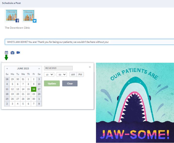 The Social Media → Schedule tab allows the publication of 1 social media post to all sites at once. Content can be written and a private photo can be uploaded or a photo can be selected from our library. Once all sites are connected to the portal, the option exists to publish a post right away or schedule it for another day and a different time.