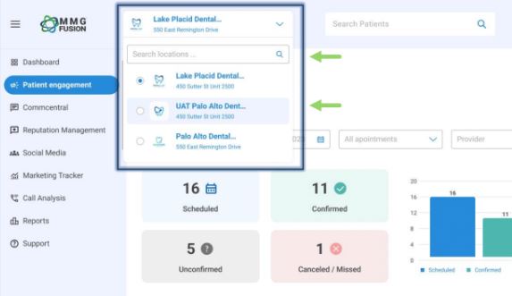 You may switch from one location to another by clicking on the down arrow next to your office name on the top left of the portal then selecting the location you want to switch to.