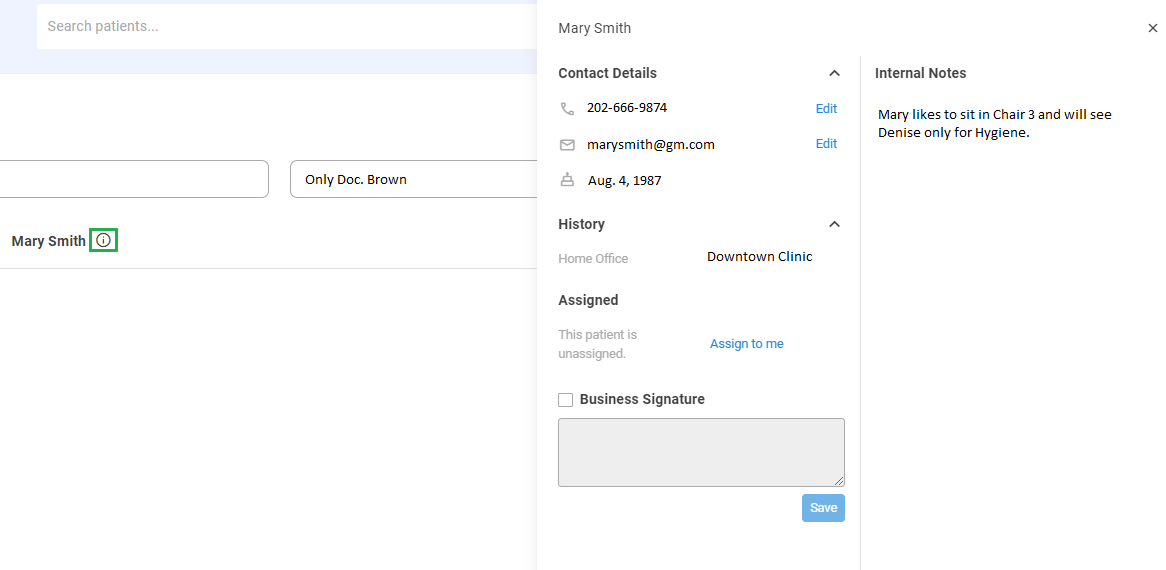 Go to CommCentral → search or click on the patient → Click on the "Patient Details" icon → You can write your notes in the "Internal Notes" section