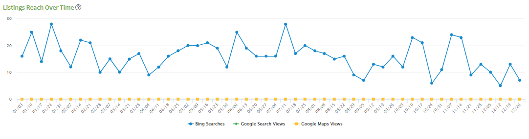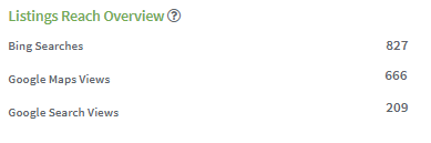The Analytics Tab under Local Directories → Analytics presents performance data aggregated from Google Searches, Google Maps and Bing. The “?” icon next to each title explains what each content block represents