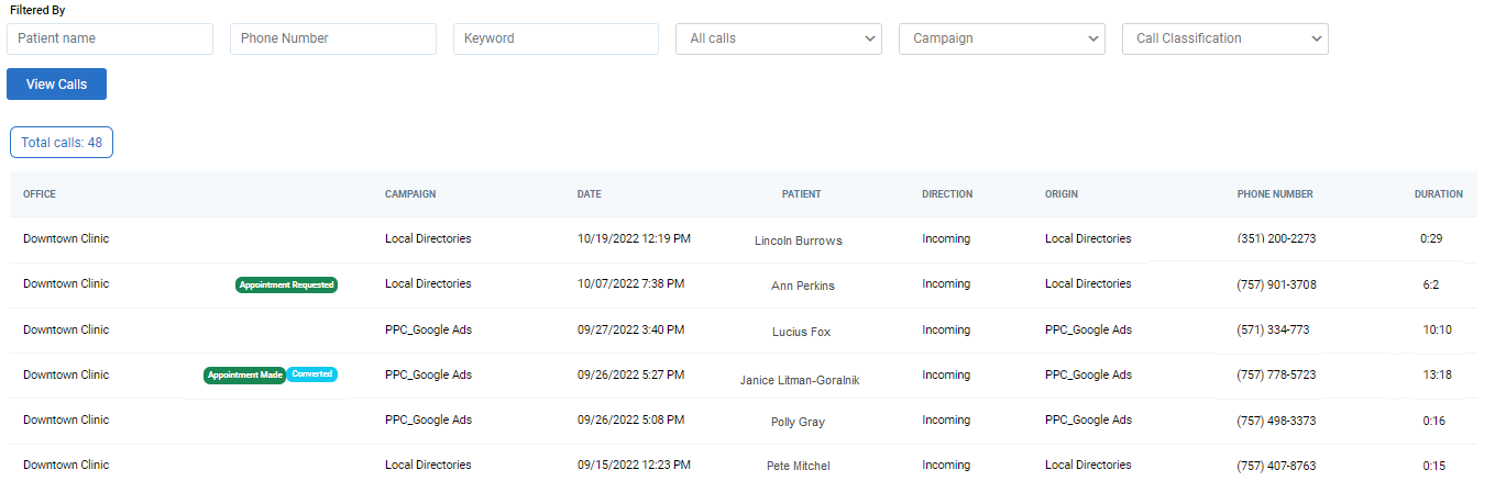 - The classification of the call into different categories such as "Appt requested", "Appt. made", "Appt discussed", etc... - In CA