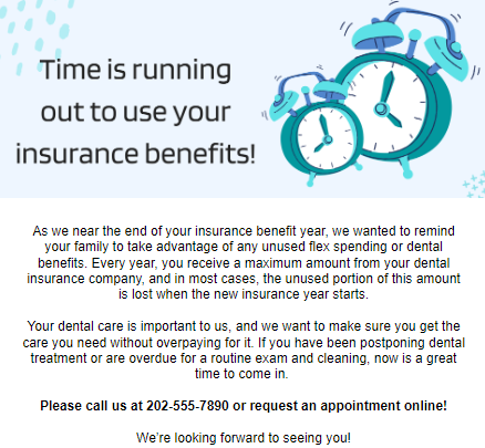 One time campaigns are created to reach the majority of your patients to communicate information such as promotions, office closures, end of the year benefit reminders, weather warnings etc... Certain filters may apply to focus on specific demographics.